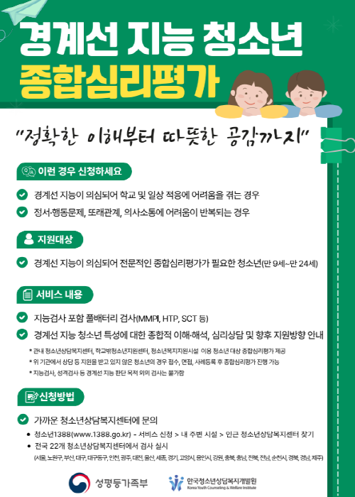 한국청소년상담복지개발원에서 경계선 지능이 의심되는 청소년을 대상으로 종합심리평가를 지원합니다.